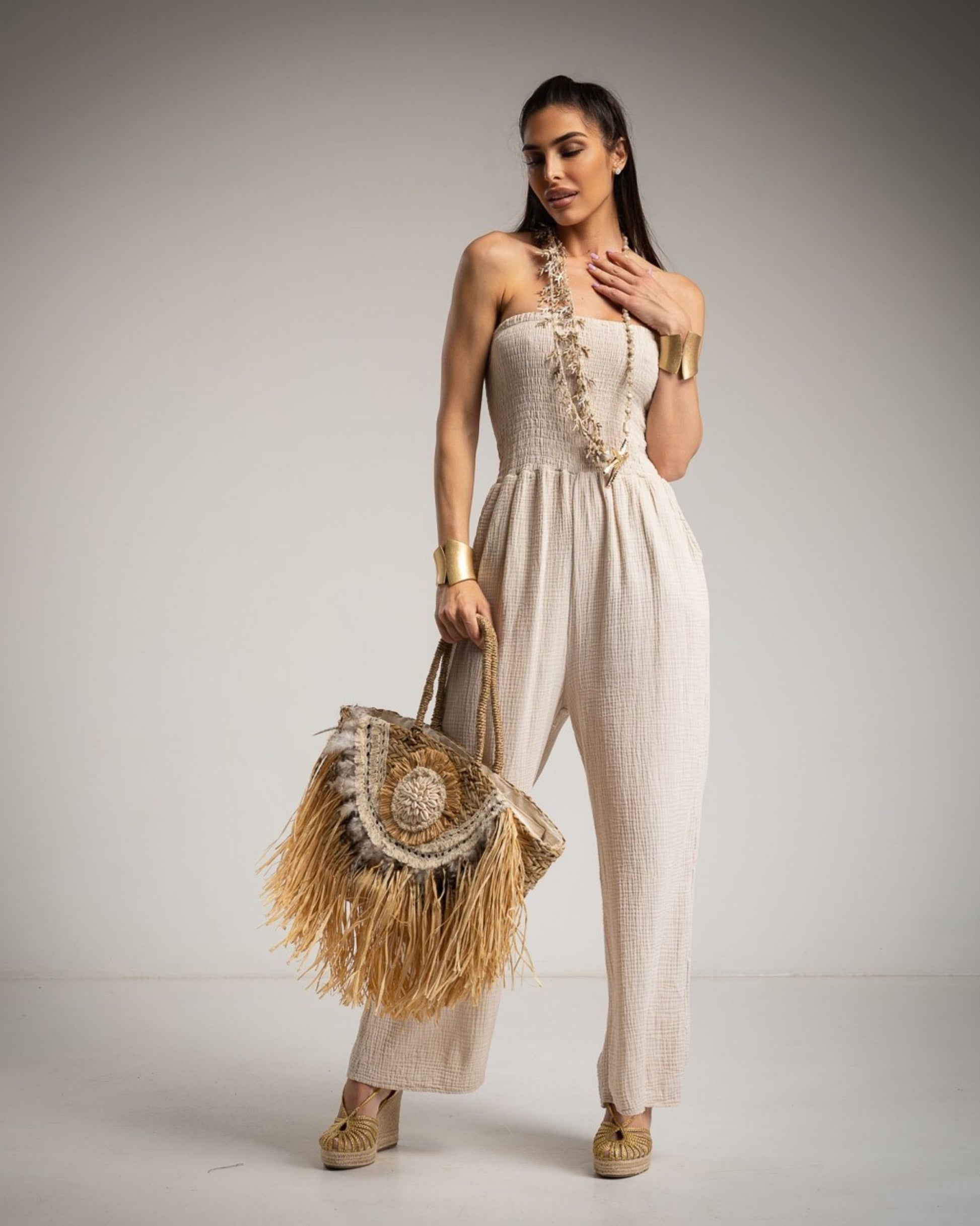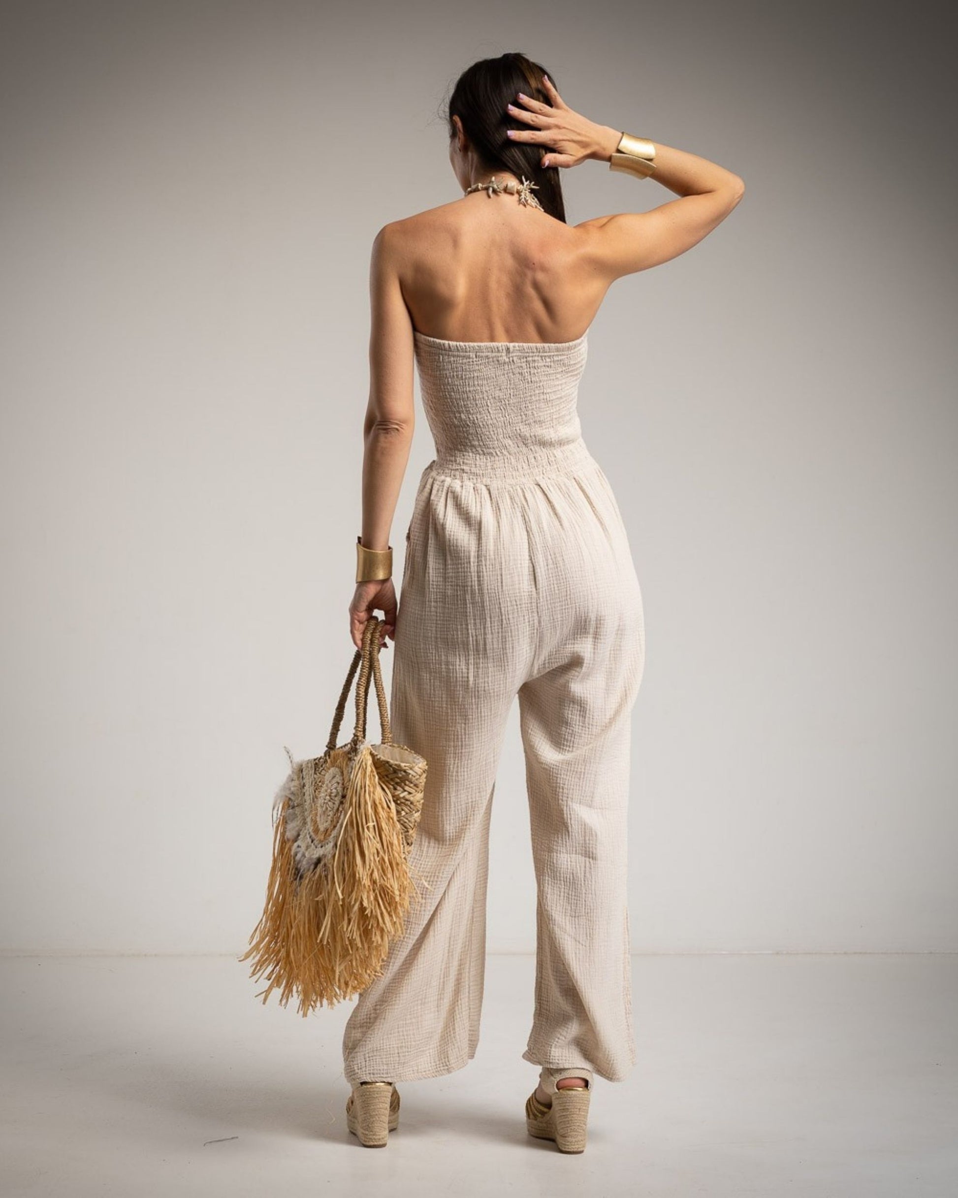 Légère et naturelle, la combinaison « Aglaë » mise sur un esprit bohème-chic. Son haut bandeau smocké épouse confortablement le buste et met la taille en valeur.