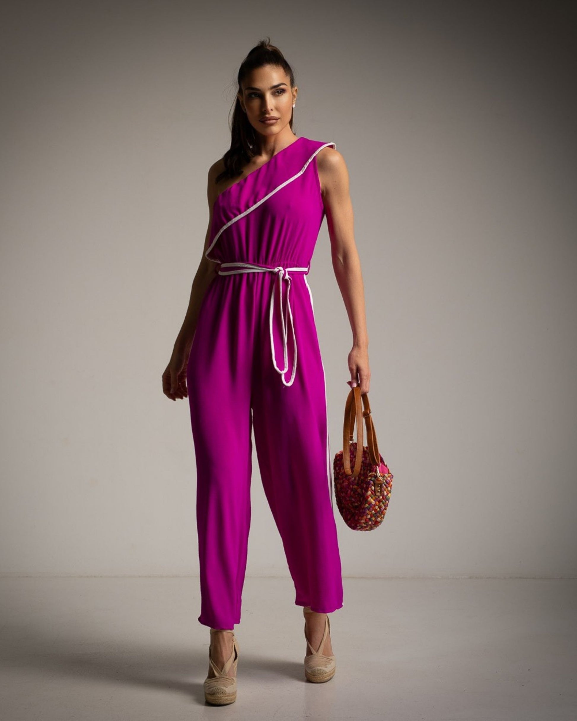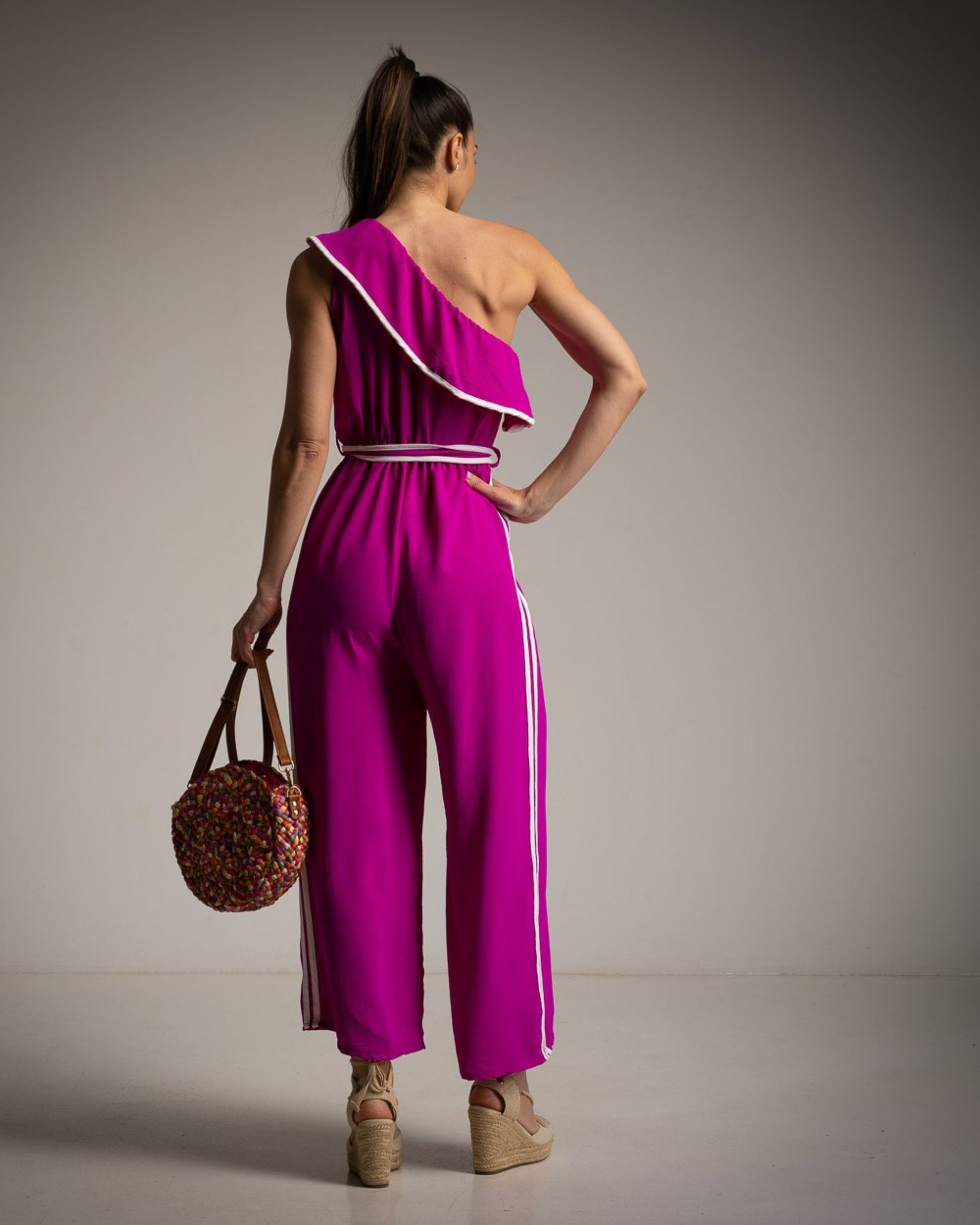 Vitaminée et graphique, la combinaison « Riviéra » illumine la silhouette avec son décolleté une épaule souligné d’un volant à liseré blanc.