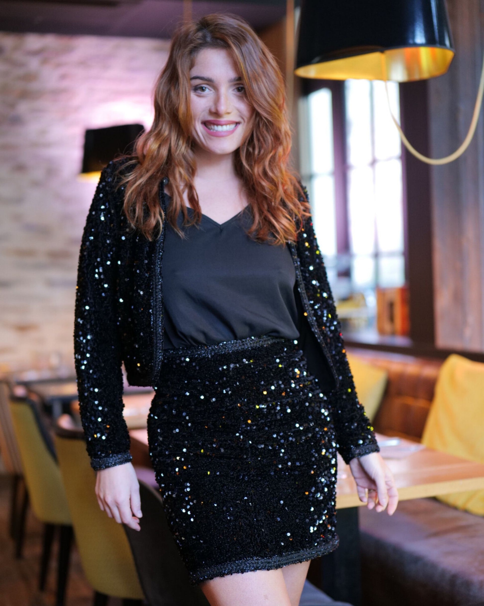 - Entièrement recouverte de sequins noirs irisés