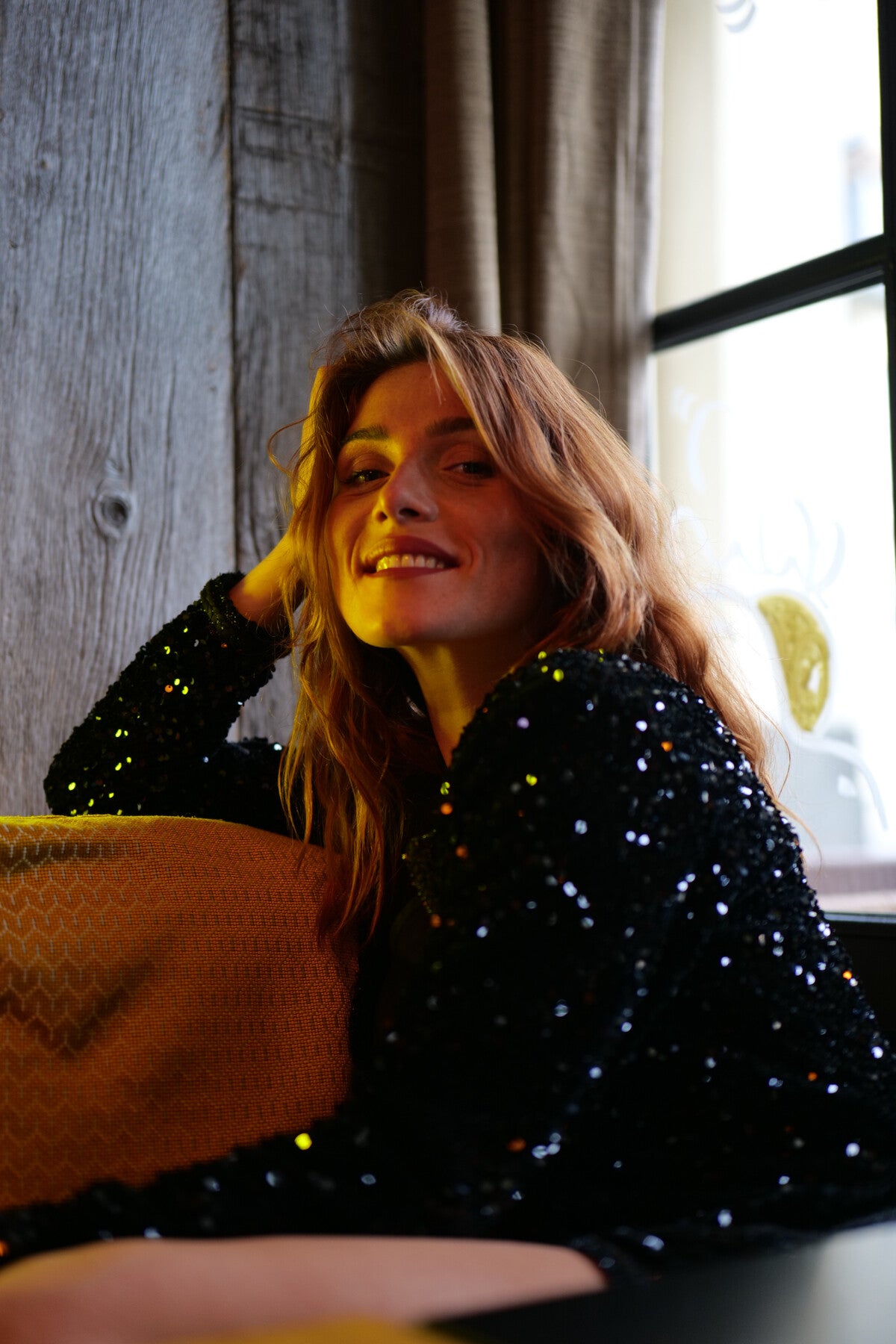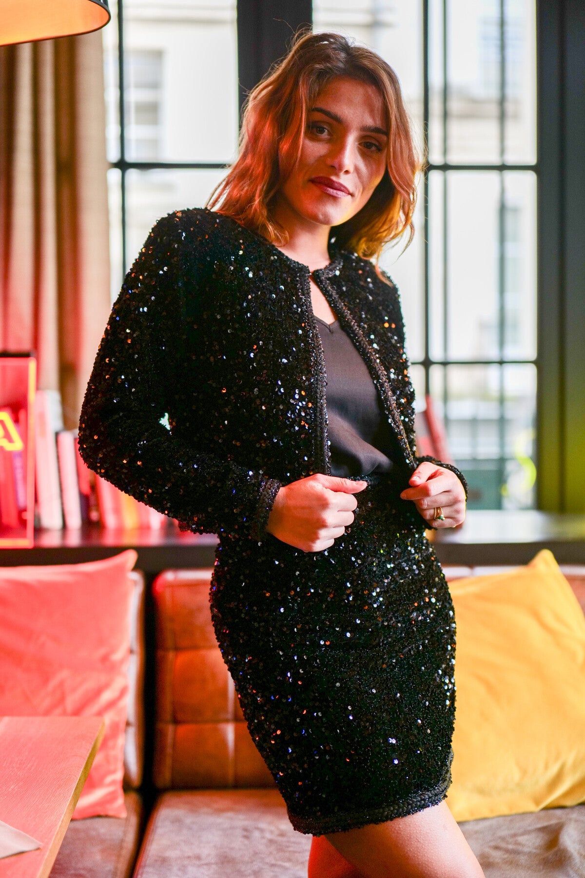 Parfaite portée avec un top uni et un jean noir pour casser le côté habillé, ou en total look avec la jupe "Inaya"** pour un ensemble ultra glamour.